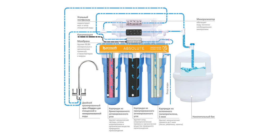 Унікальна модель фільтра зворотного осмосу Ecosoft Absolute з мінералізатором не лише збагачує воду корисними мінералами, але й забезпечує економне споживання води.
