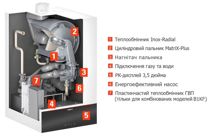 Viessmann Vitodens 100-W B1HG є одноконтурним конденсаційним котлом, який призначений для опалення будинку природним або скрапленим газом. Корисна теплова потужність котла (3,2-32 кВт) та його ККД 109% дозволяє забезпечити ефективний обігрів приміщень площею до 320 м кв. Високий рівень ККД забезпечується модульним пальником MatriX-Plus з інтелектуальним контролером згоряння Lambda Pro. Ця комбінація технологічних рішень спалювання газу в котлі дозволила також знизити рівень викиду шкідливих речовин.